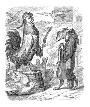 Reynard the Fox preaches to a variety of fowl, soon to be devoured.
